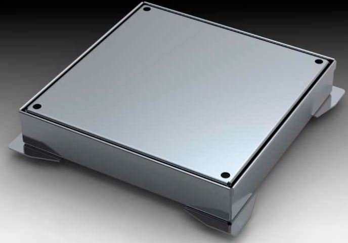 Tapa de arqueta estanca lisa de acero inoxidable AISI 304. Cierre por cuatro tornillos y unión por junta de EPDM. Puede ser sencilla para paso peatonal (clase de carga A15) o reforzada para paso de vehículos (clase de carga B125).